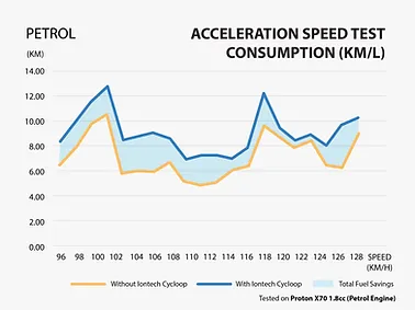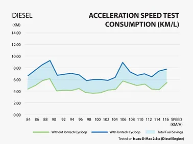 The IonTech “Cycloop” is claimed to achieve lesser fuel consumption during acceleration compared to using a standard or conventional method to achieve a specific speed in a vehicle. When comparing the consumption of fuel using IonTech “Cycloop” technology versus the conventional method, the following observations was made: